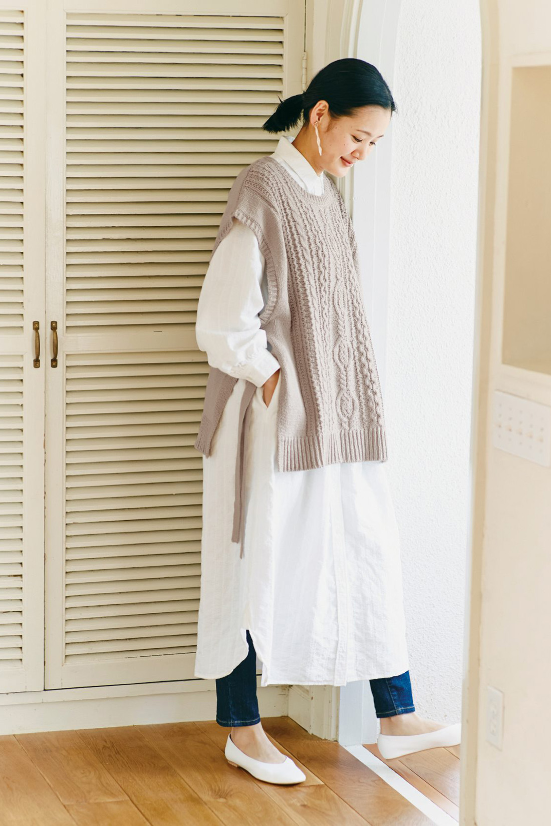 ベーシックなデザインの白シャツワンピースは、自由自在に着こなしのアレンジが楽しめる万能アイテムです。今年らしい抜け感漂うレイヤードコーデを叶えるなら、ゆったりとしたシルエットのニットベストをプラスした着こなしがおすすめ。 さらにデニムを重ねてカジュアル感を加えてあげると、表情豊かな足もとを演出することができます。フラットパンプス&揺れ感ピアスを合わせれば、ちょっぴりお出かけ仕様に。