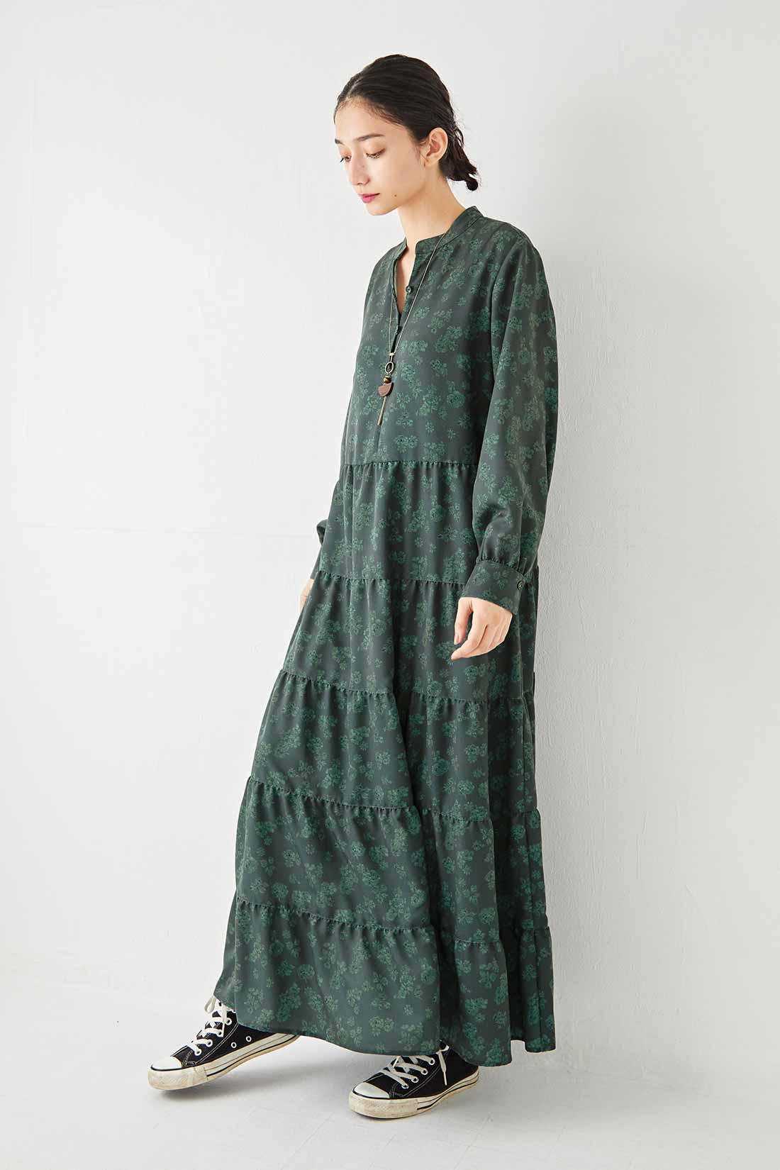 グリーンベースのヴィンテージプリントティアードワンピースをスニーカーでカジュアルに着こなしたニュアンスフェミニンスタイル