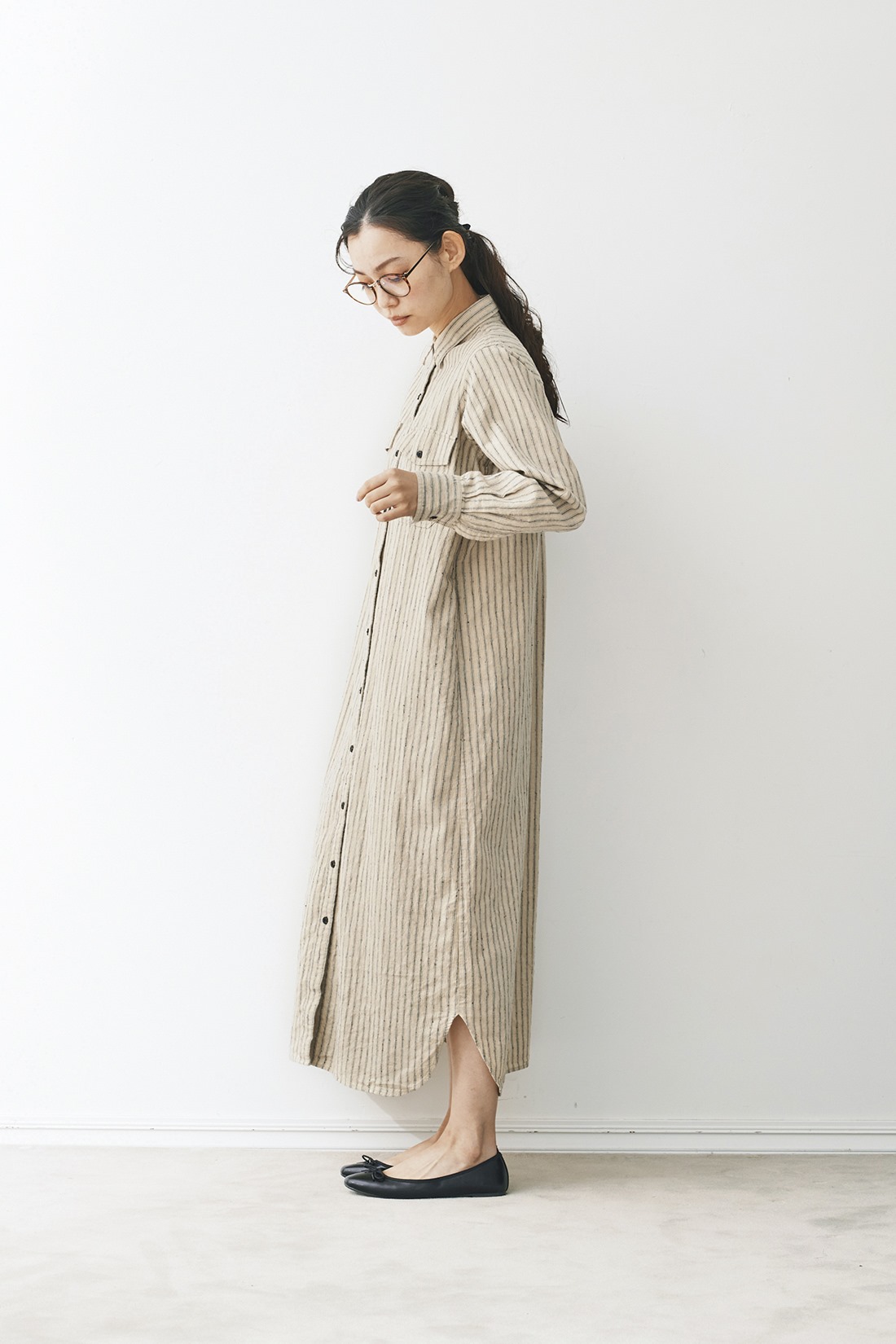 ナチュラル感のある着こなしがお好みなら、綿麻素材など素朴な風合いのマキシ丈シャツワンピースがおすすめです。シャツ型を活かし、ボタンをいくつか外して襟を抜いたり袖をロールアップするなど、気分によって着こなしのアレンジを楽しむのが遊び心があって素敵◎ そのままシンプルに着こなす時は、足もとに合わせるシューズ選びで変化をつけましょう。カジュアル感を強調したいならスニーカーを、ちょっぴり可愛げムードをプラスするならバレエシューズを合わせるのがGOOD。