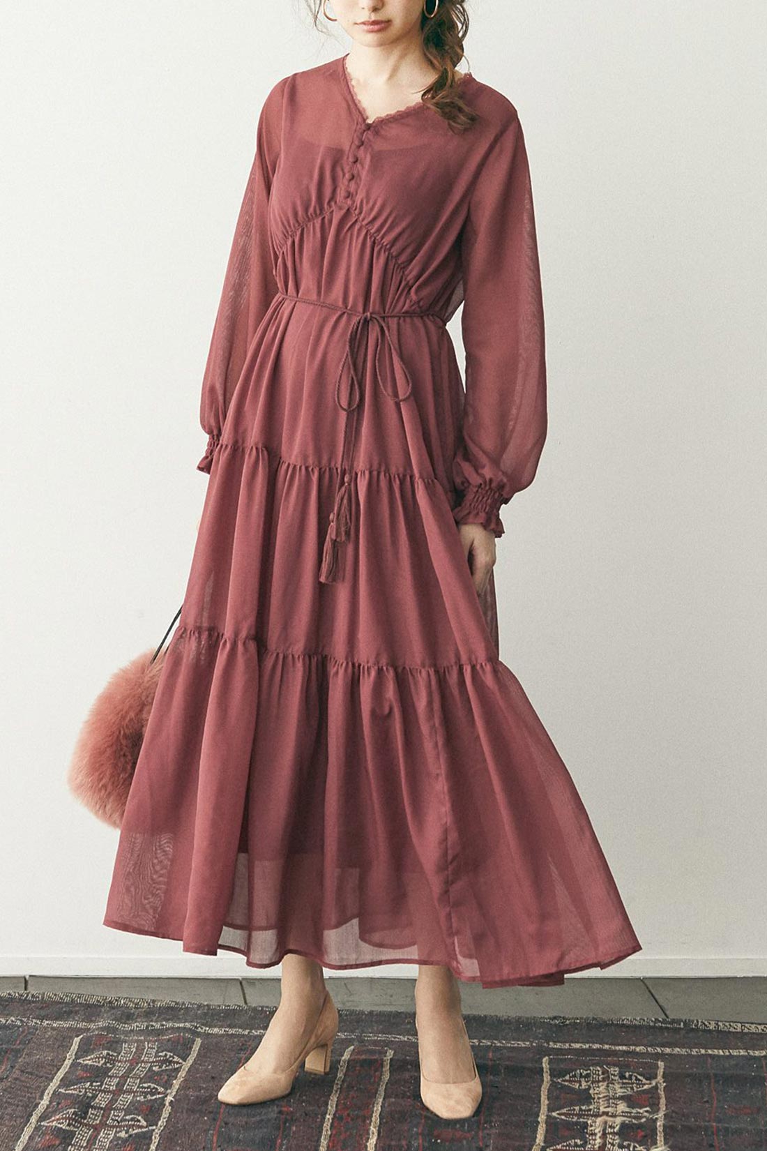 ワインカラーのティアードマキシドレスでロマンティックフェミニンスタイル