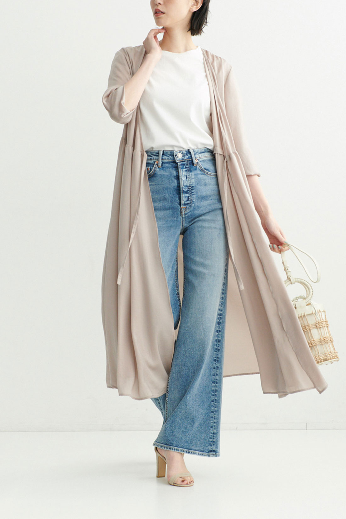 今季注目のピンクベージュに合わせるのはサックスブルーのデニムがおすすめ。一枚で着映えが叶うカシュクールワンピースは女性らしく、さらっと着るだけでコーデにメリハリがつきスタイルアップ効果も叶います。ほどよくフレアー感があり、コーデ全体を優しい印象に導いてくれます。
