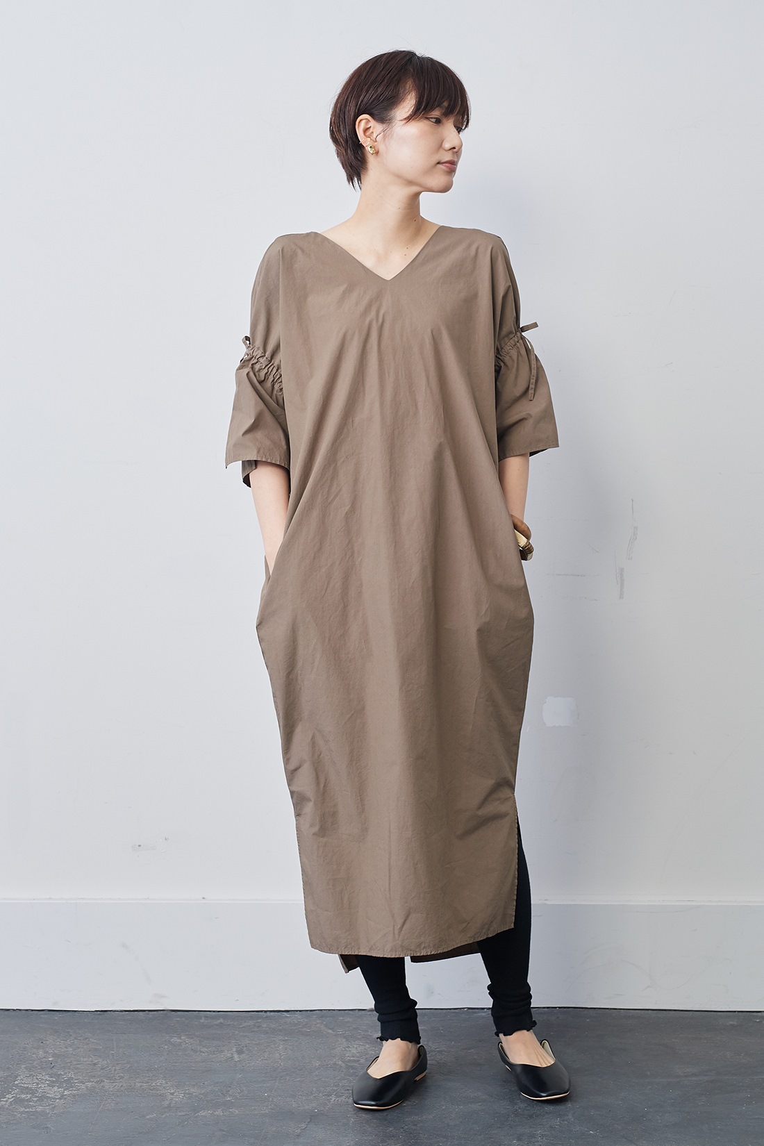 抜け感のある女性らしいスタイルに仕上げてくれるVネックワンピースは、今季取り入れたいアースカラーのモカブラウンで一気にこなれ感を引き立てましょう。黒のレギンス合わせが奥行きをメイクしてくれリラックススタイルに。また、ゆったりとした楽な着心地なのでおうちコーデにも最適◎