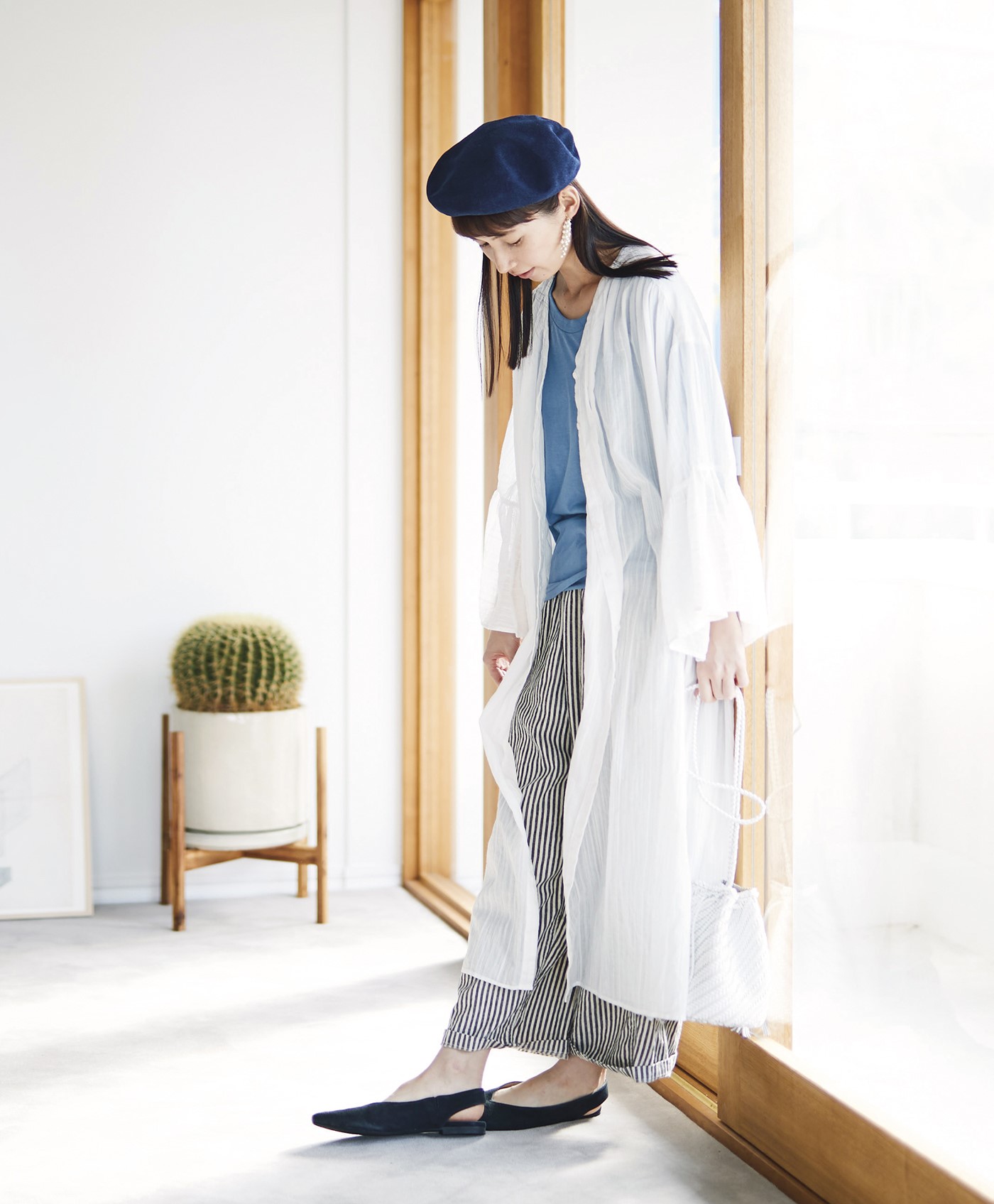 この春夏に外せないミントグリーンは、インにプリントカットソーとフレアーパンツを合わせてガウンワンピースとして取り入れてトレンド感を存分に演出。小物はグレージュのキャスケット、ラタンバッグ×白でニュートラルカラーを意識してミントグリーンを主役に。
