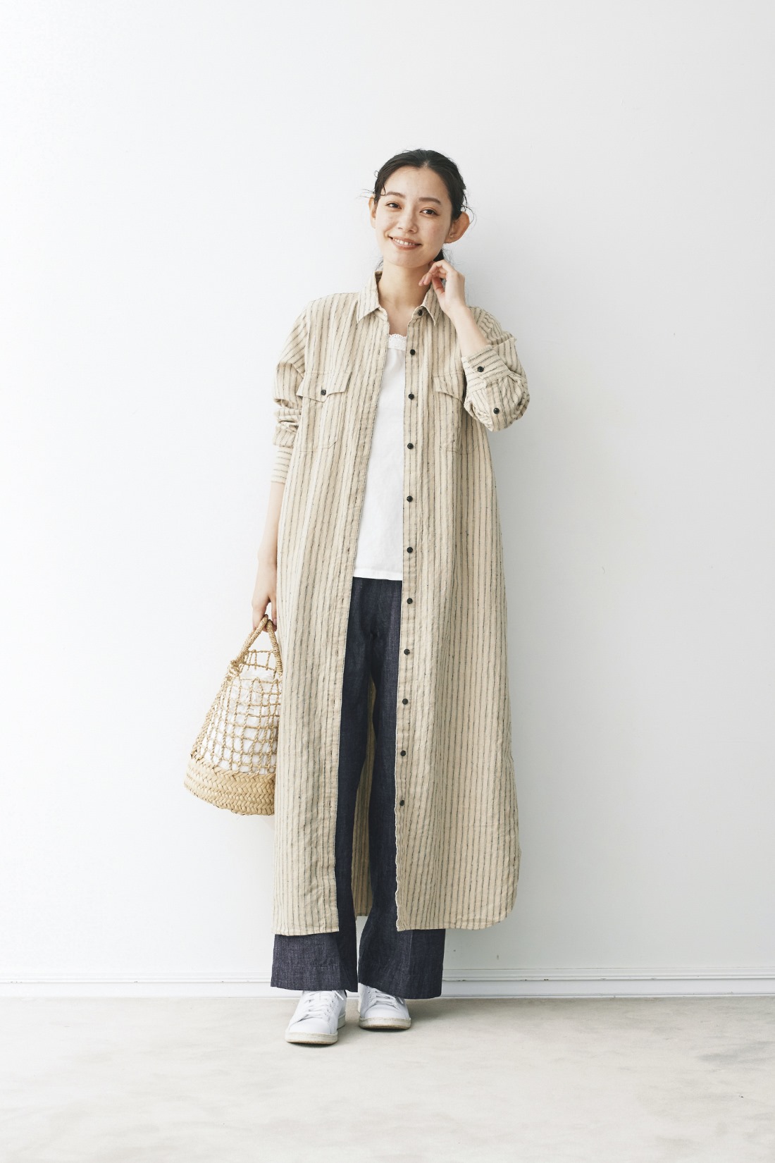 コットンリネンのナチュラルな色合いのベージュに黒のストライプ柄が大人っぽさを演出してくれるシャツワンピース。デニム地のワイドパンツをチラッと見せるとほどよくカジュアルになリ、リラックススタイルが叶います。かごバッグと白スニーカーで季節感をプラスして。