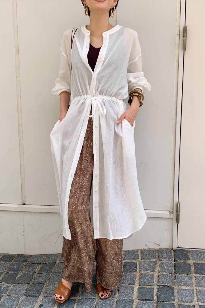 今季一枚は持っておきたい清涼感たっぷりな白シャツワンピースに、差し色でブラウンのワイドパンツをレイヤード。こなれ感ある着こなしに仕上がり、コントラストの効いた配色がキレのある印象に導いてくれます。大ぶりなピアスやバングルの重ね付で女性らしさも忘れずに。
