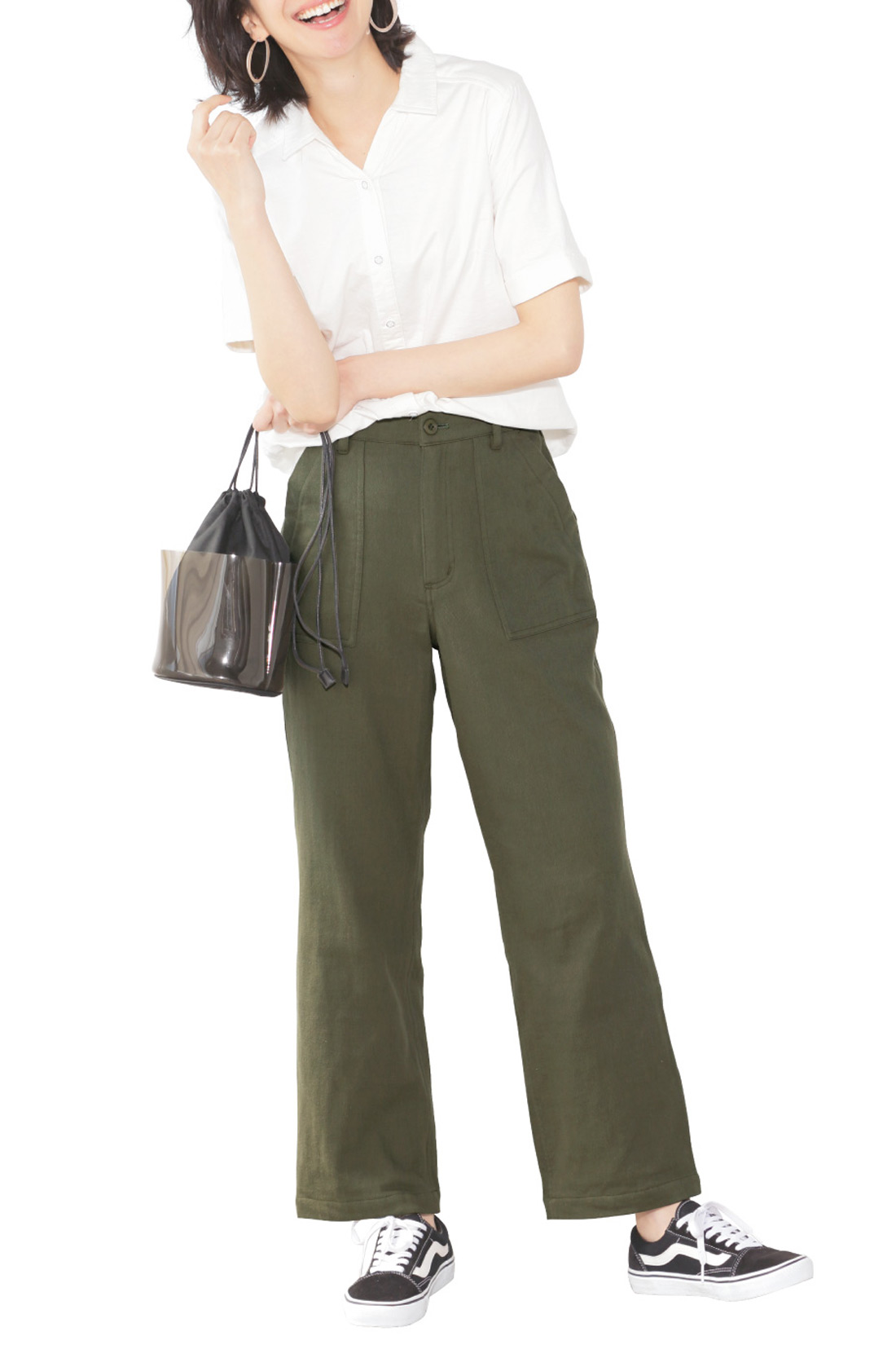 ダブルガーゼにストレッチ性をプラスした動きやすさ抜群のスキッパーシャツ。長めの丈感なのでインでもアウトでも自由自在。ボトムスはカーキのワイドパンツでハンサムな大人スタイルに。足もとはモノトーンのスニーカーを足首を見せて履くことでこなれた雰囲気に。