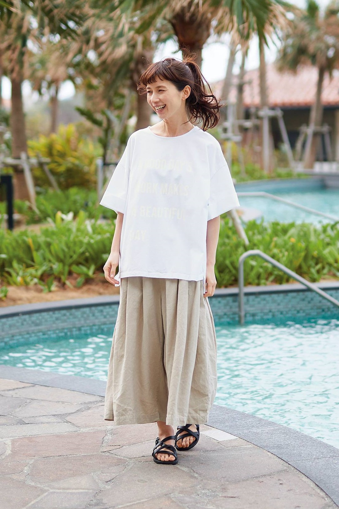 デイリーに着回せるロゴTはシルケット加工を施した滑らかな風合いと、白でさりげなく入ったロゴプリントが大人っぽくきまる一枚。ボトムスにはベージュのキュロットパンツを合わせ女性らしさを演出。白×ベージュの淡い配色は黒のサンダルで引き締めましょう。