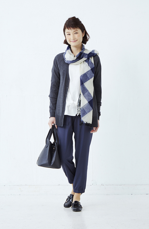 スモーキーカラーのトップスは差し色にもなり、華やぎもアップ。ストールをプラスして、着こなしを盛り上げよう。