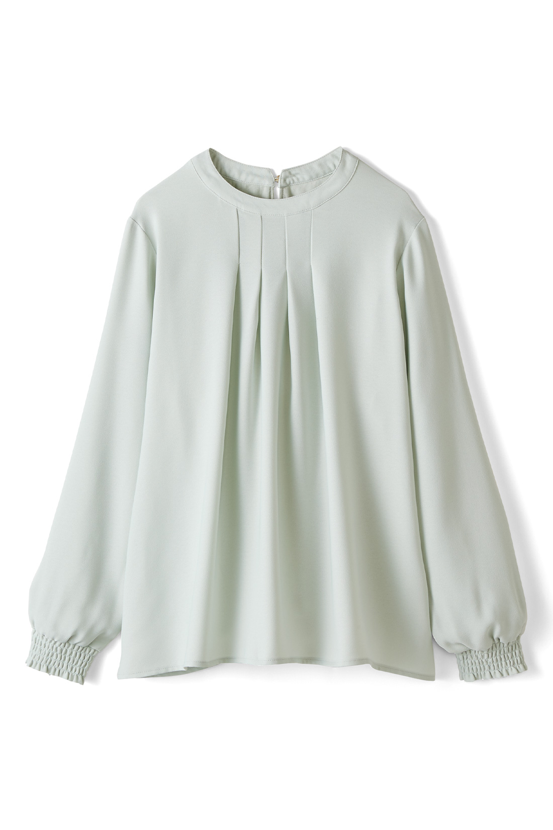 ペールグリーンのブラウスに少しだけハイネックになったリブニットの2点。スカート編で使ったワンピースとタートルニットのセットのタートルや、ニットベストも着回しに使っています。