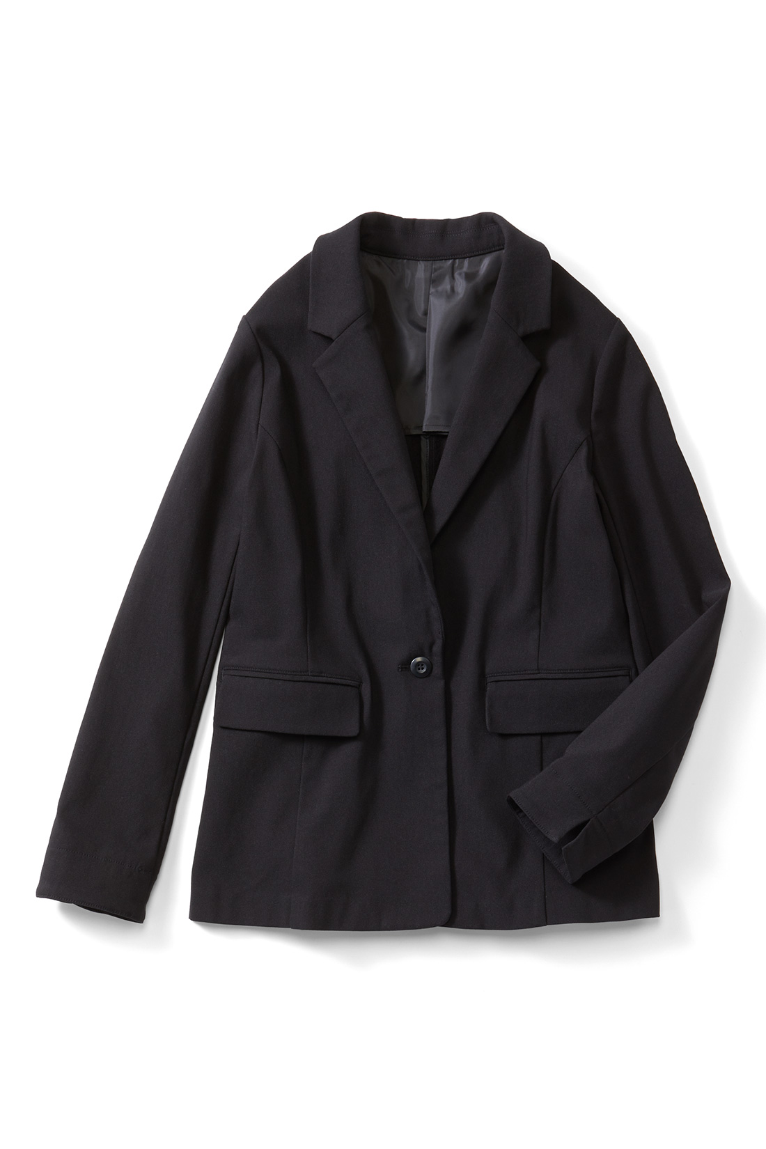 定番のブラックのジャケットは、きれいに見えて実はカットソー素材の動きやすさがポイントの一枚。