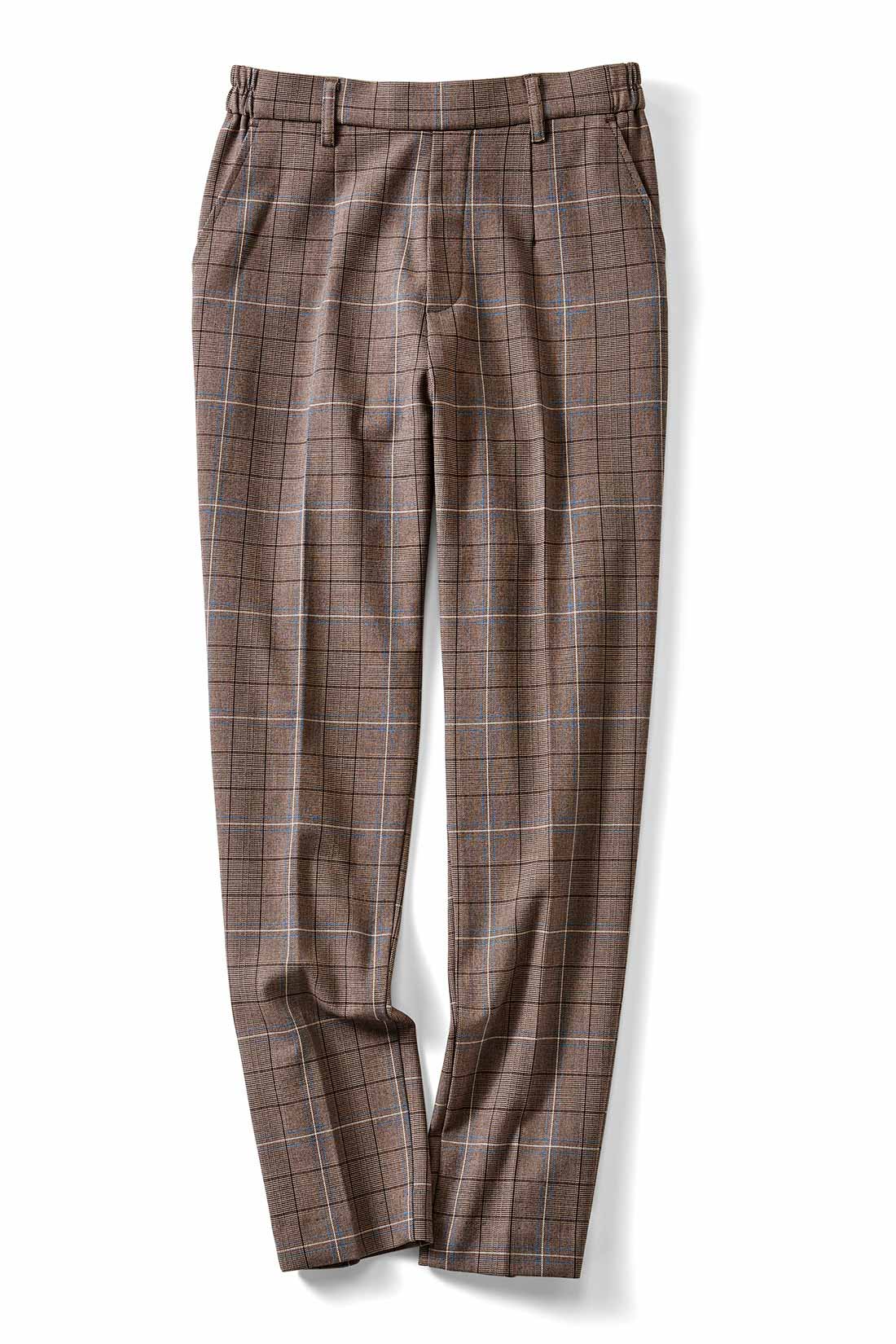 無地のワイドパンツとブラウンベースのチェック柄テーパードパンツの2本。柄と無地、シルエットの違いで着こなしに変化を付けます。