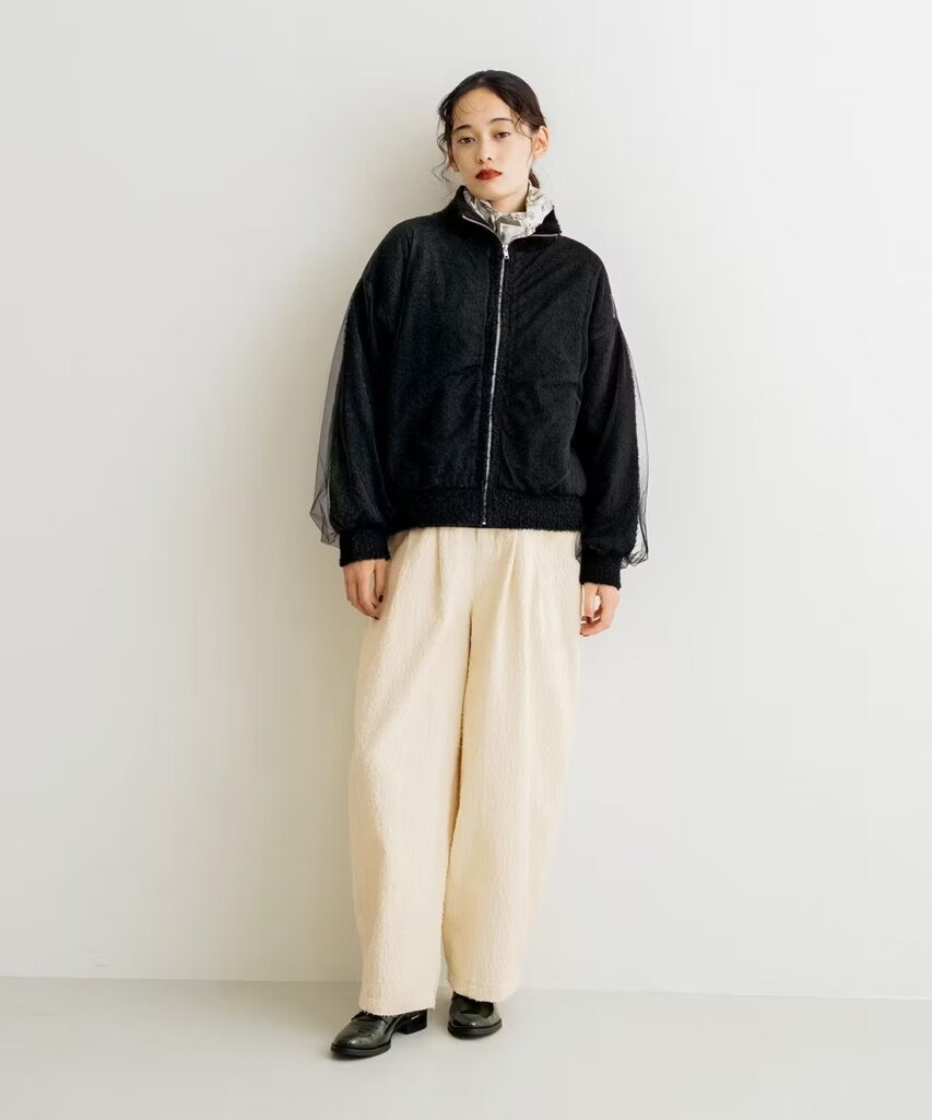 白は膨張色でもあるので、ワイドすぎるシルエットだと一層着ぶくれして見えることも。着やせを狙うなら、太すぎないストレートシルエットがベストバランス。すっきり見えと体型カバーの両方を叶えられます。