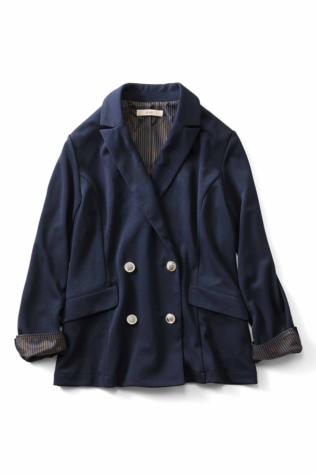リラクシーに着こなせる紺ブレをセレクト。伸びやかなカットソー素材だから窮屈感がなく、さらりとはおれる一枚です。