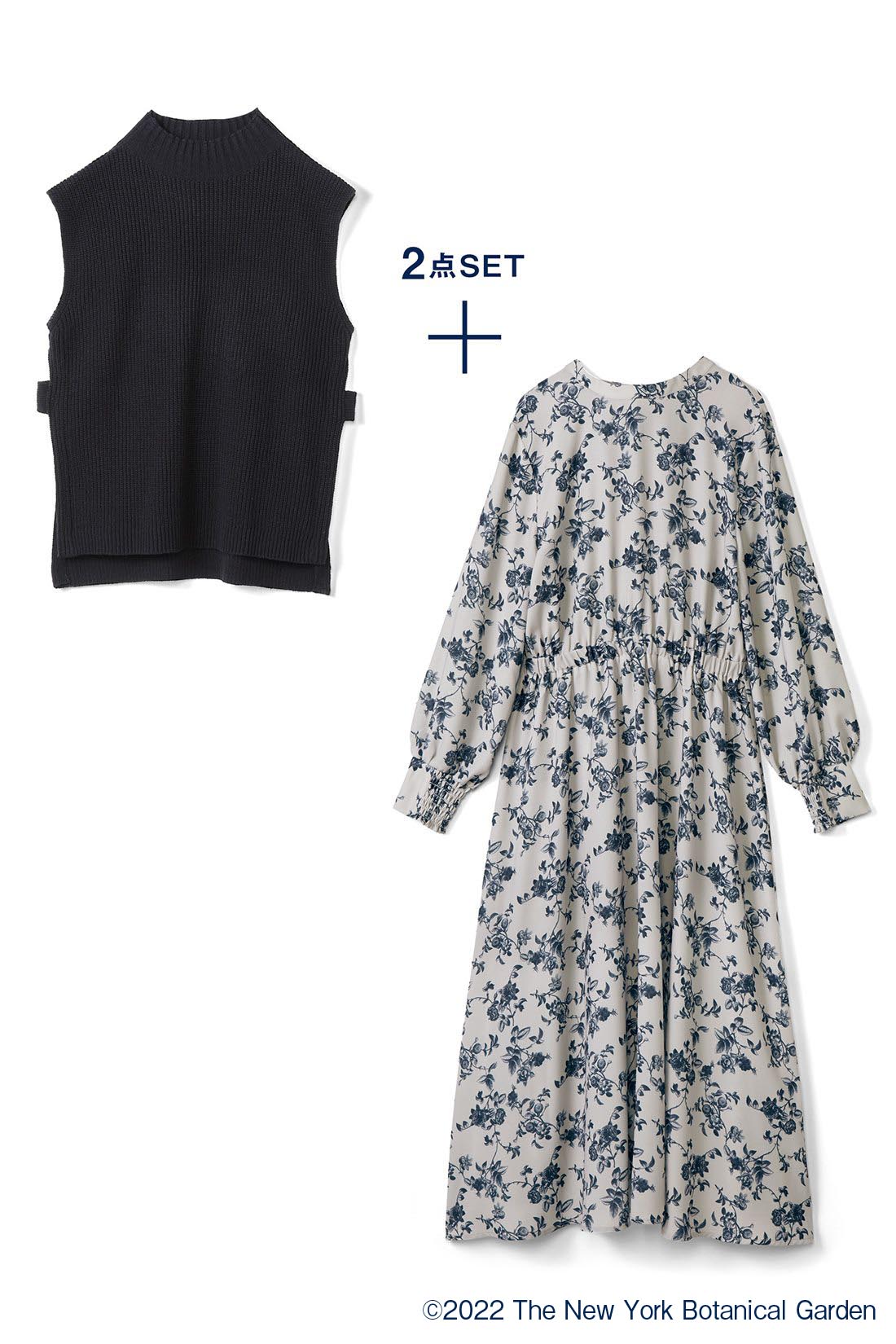 サンドベージュをベースに、ネイビーの花柄がシックな中にも華やかな印象のワンピース。ウエストから広がる優美なシルエットは、女性らしさが引き立つぜいたくなフレアーシルエットです。セットのベストはサイドスリット入りで着まわし力も高く、ワンピース単体でも、セットで着ても大人上品に仕上がります。