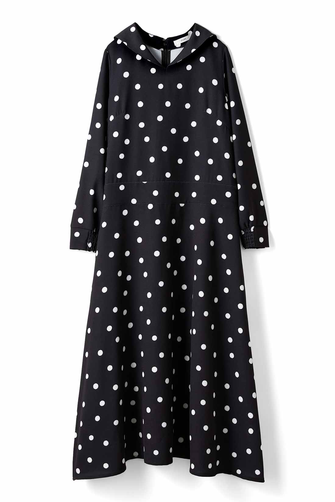 ブラックベースに白のドット柄がシックな大人のためのワンピース。すっきりとしたVネックに、動くたびに揺れるすそとドレープがきれいなワンピースです。落ち感のある素材を使用しているので、細見えするシルエットも魅力。バックの小さな衿がアクセントになり、今っぽい雰囲気をプラスしてくれます。