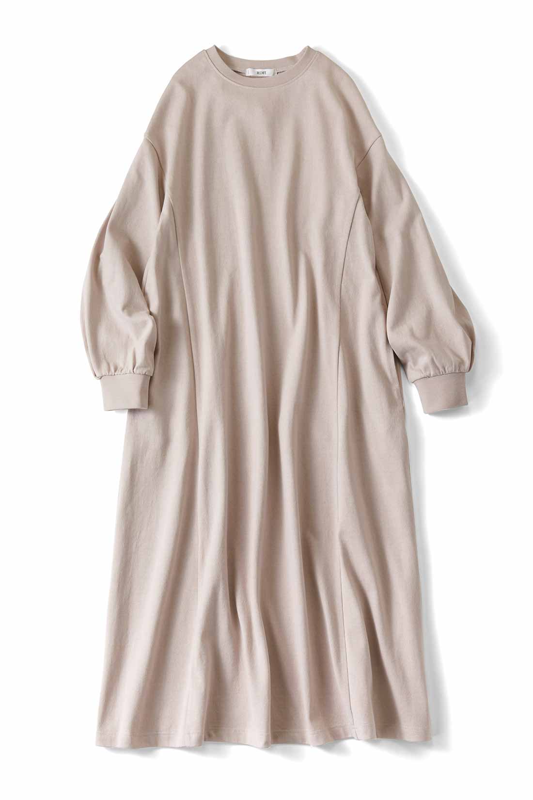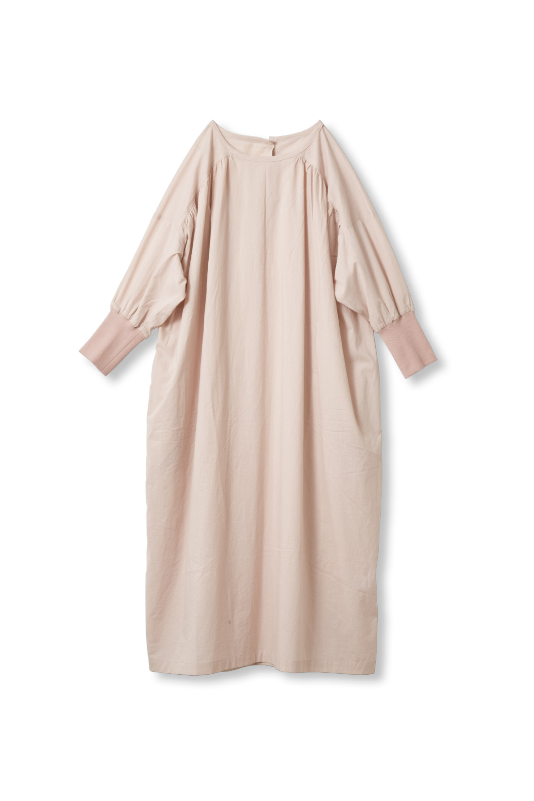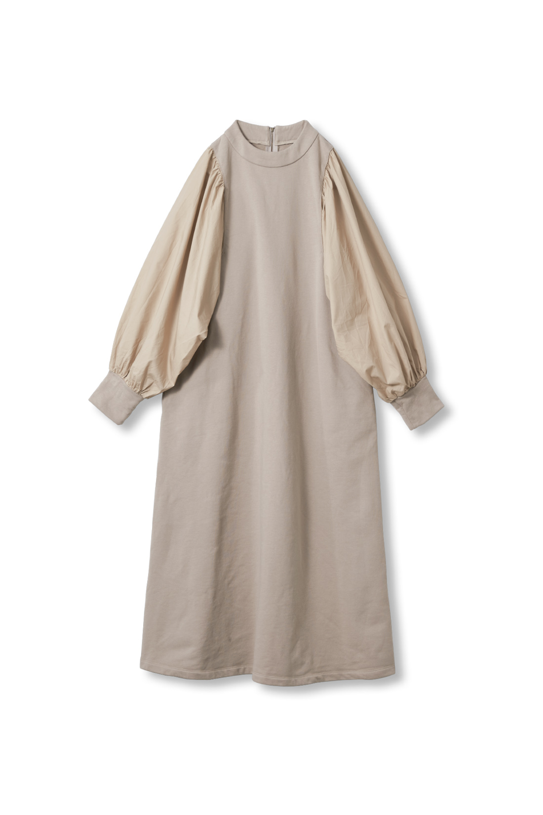 身ごろは綿ポリ素材のミニ裏毛生地を使用し、袖部分は綿の布はく生地で仕上げた着心地もおしゃれも両立させたワンピース。素材にメリハリを出すことと、ベージュとグレージュのような独特な配色でモダンな印象です。袖は、あえてボリュームをもたすことで、女性らしいやさしい印象に。