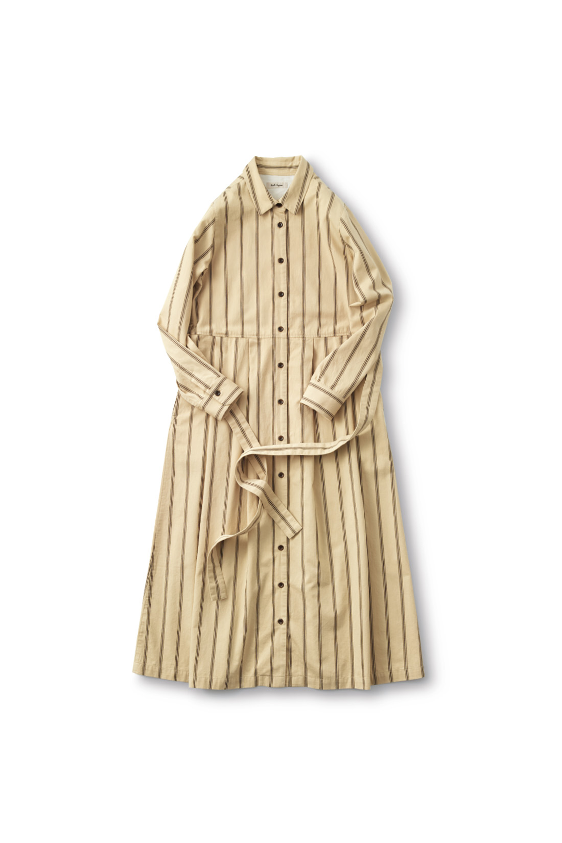 ライトベージュにブラウンのストライプ柄がコントラストの利いたコットンワンピースは、上半身をややコンパクトに仕上げ、クラシカルな印象です。縦ラインを強調するストライプ柄とAラインシルエットがほどよくボリューム感を抑えてくれます。一枚でラフに着ても、ウエストマークをして着てもすっきりとしたシルエットに。