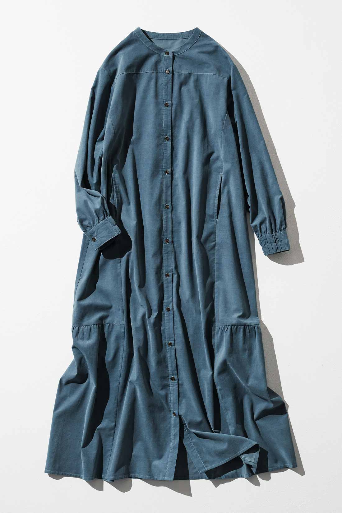 コットン100%のコーデュロイ素材を使用し、グレーがかったブルーカラーが大人っぽいワンピース。バンドカラーにたっぷりとした身幅、バックのヨーク切り替えやサイドからバックにかけて入れたティアードデザインが女性らしさを演出。ワンピース使いだけでなくアウターとしても羽織れて、さまざまな表情のスタイリングが楽しめます。