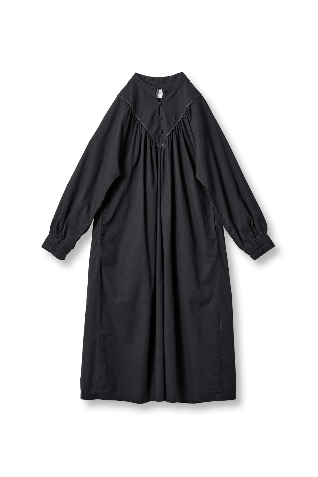 フロントをV字切り替えに、バックはラウンドさせたヨークにギャザーをたっぷりと入れ、ふんわりと着られるワンピース。スタンドカラーにスエードの包みボタンがアクセントとなり、ゴム仕様のパフスリーブは、プッシュアップしてボリュームをアレンジできます。ナチュラルなコットン素材のワンピースは、一枚でもレイヤードでも着まわせます。