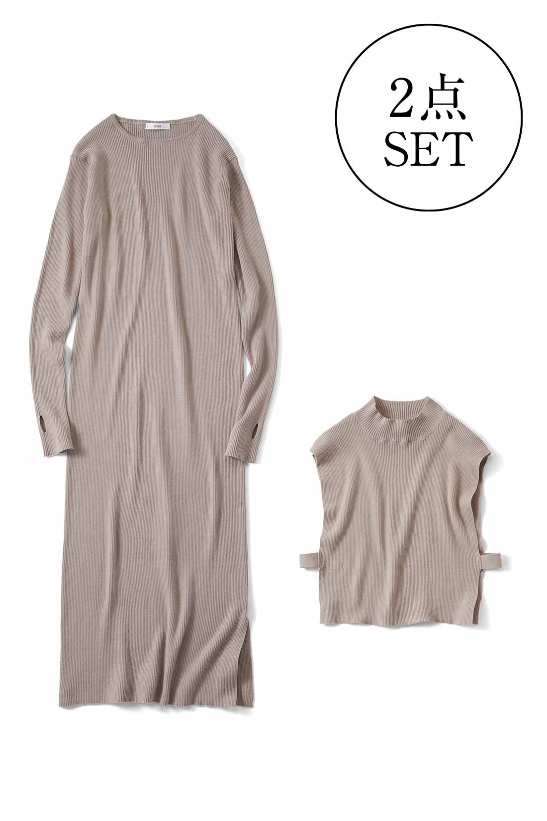 シンプルなクルーネックのワンピースとハイネックのベストを合わせたニットセット。すっきりしたラインのロング丈でも、左サイドに入ったスリットで動きやすさもばっちり◎。サムホール付きの袖は長めな丈感がモードな印象に。適度な張りと厚みのあるコットンニットは、からだのラインを拾いにくく、リブ編みが縦長印象を高め、スタイルアップ効果も期待できそう◎。