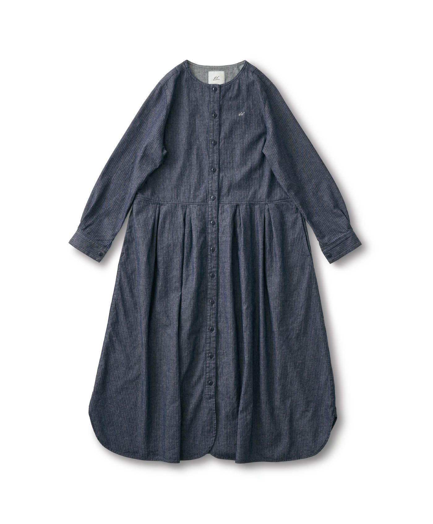 ヘリンボーン模様が織り込まれた大人っぽいノーカラーのデニムワンピース。インディゴ染めの生地は着こむほどに味わいの出る素材。ウエスト切り替えにタックを入れ、ほどよいボリューム感を出したワンピースは、スニーカーやブーツなどとも合わせやすくデイリーにもお出かけにも着まわせます。