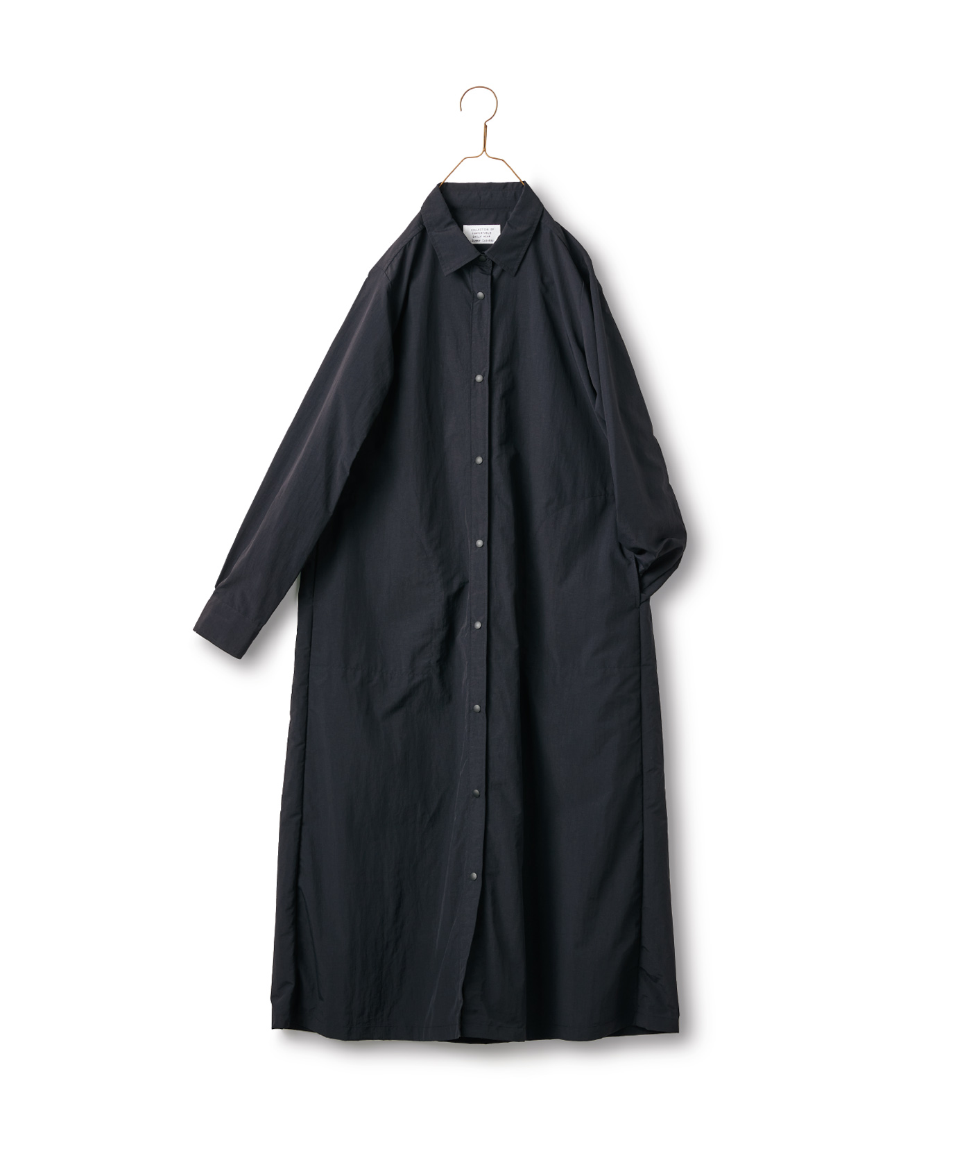 マットで落ち着いた雰囲気が特徴の、ナイロン素材で仕立てたコートにもなるワンピース。ワッシャー加工を施しているので、洗いざらしのような味のある風合いが楽しめます。とても軽く、しっとりとした肌ざわりで撥水加工も嬉しいポイント。一枚でワンピース、前を開けてライトアウターとして、同素材のパンツとセットアップコーデも楽しめます。
