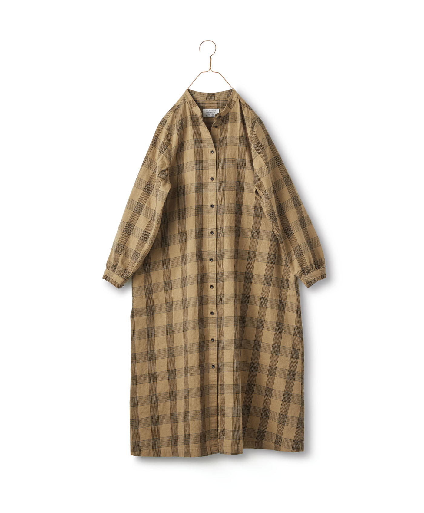 綿麻素材で仕上げた素朴な風合いのグレンチェック柄ワンピース。秋らしいライトブラウンにダークブラウンのチェック柄が華やかな印象です。Aラインシルエットのシャツワンピースなので、羽織としても使える使い勝手のいいアイテム。ウエストゴム仕様のワイドパンツとセットアップで着ると、また違ったコーデも楽しめます。