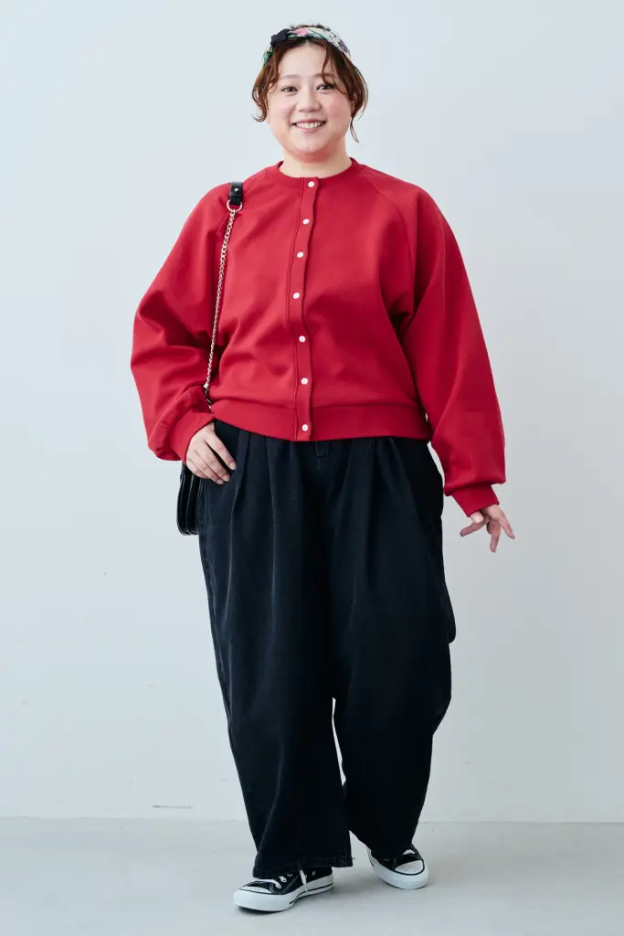 すそに向かってゆるやかに細くなるカーブパンツは、太ももや腰を自然にカバーできるアイテム。近年トレンドのシルエットなので、シンプルな装いでもこなれた雰囲気になりますよ。ボリューム袖のカーディガンは、前を留めてプルオーバー風に。丸みのある体形をチャーミングに活かす、大人かわいいコーデです。