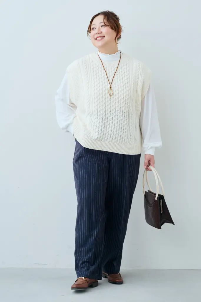 上半身ぽっちゃりさんは、視覚効果をうまく使ってスタイルアップを実現。チャームの付いたロングネックレスは、顔まわりををすっきり見せてくれるアイテムです。ケーブル編みのニットベストは、縦に視線が流れるデザインを選ぶのがコツ。ストライプ柄のパンツを合わせれば、さらに縦長効果がアップしますよ。