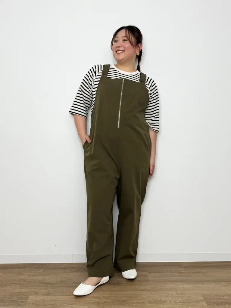 カーキのサロペットは、ゆとりがありつつもすっきりとした直線的シルエットが魅力。フロントのジップが、自然な縦長効果を演出します。インには爽やかなボーダーTシャツを選んで、休日感たっぷりのリラックスカジュアルコーデに。足もとは白のローパンプスで、女性らしく仕上げるのがポイントです。