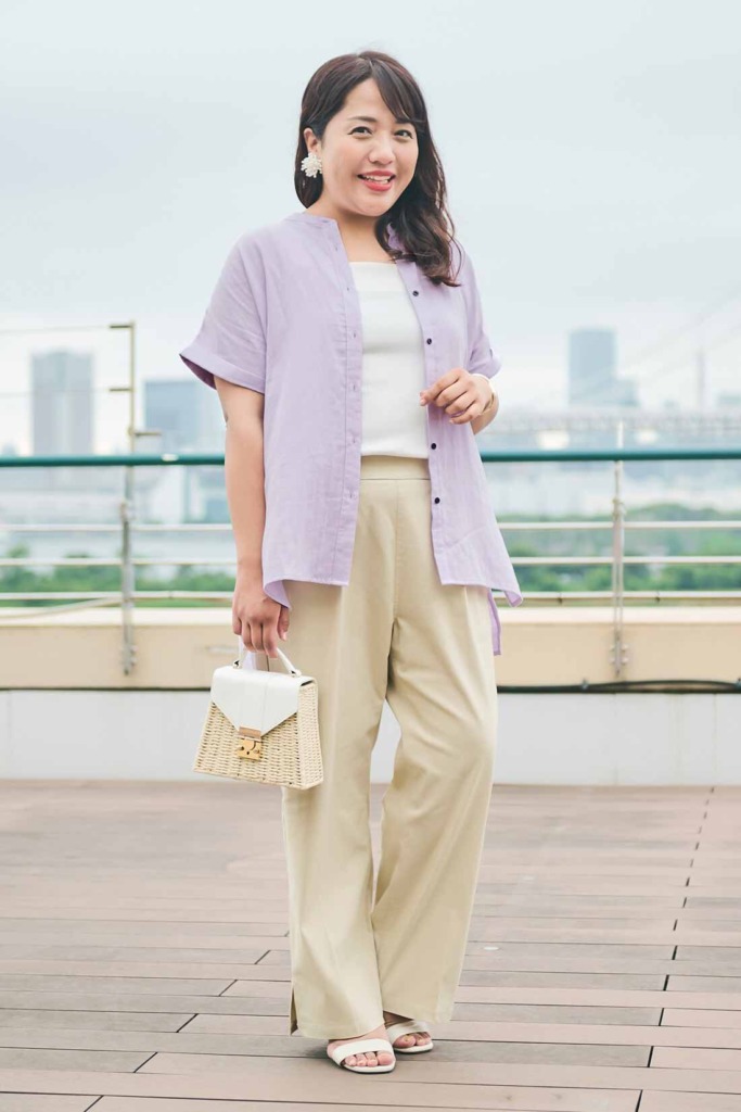 30代の大人女子は、ほんのり甘いきれいめカジュアルスタイルがおすすめ。淡いラベンダー色のシャツが、大人のかわいらしさと上品さを演出してくれます。アイボリーのストレートパンツは、白トップスと合わせることで脚長効果アップ。フェミニンなホワイト小物を加えて、夏らしく爽やかに仕上げたコーデです。