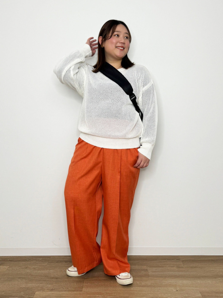 ゆるっとラフな装いが得意な骨格ナチュラルさんには、スポーティーなカジュアルコーデがおすすめ。ドライなタッチのメッシュニットは、自然な透け感で軽やかな印象に。フレッシュなオレンジ色のイージーパンツを合わせて、メリハリを演出しましょう。黒のクロスボディーバッグで、アクセントを加えると◎です。