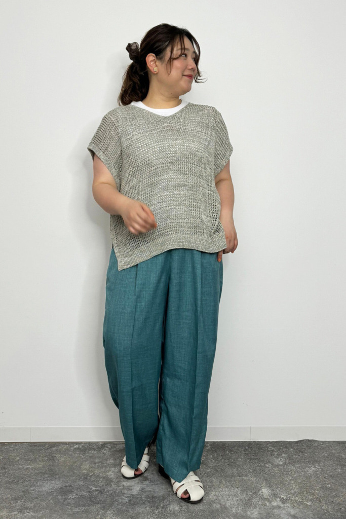 すとんと落ちるストレートパンツは、どんなトップスにも合わせやすいのが魅力。鮮やかなカラーを選んでも、主張しすぎません。透かし編みニットベストは、気になる二の腕をカバーできるフレンチスリーブ。ゆるやかなVネックで、顔まわりもすっきりと演出しましょう。色合わせも涼やかなお手本夏コーデです。