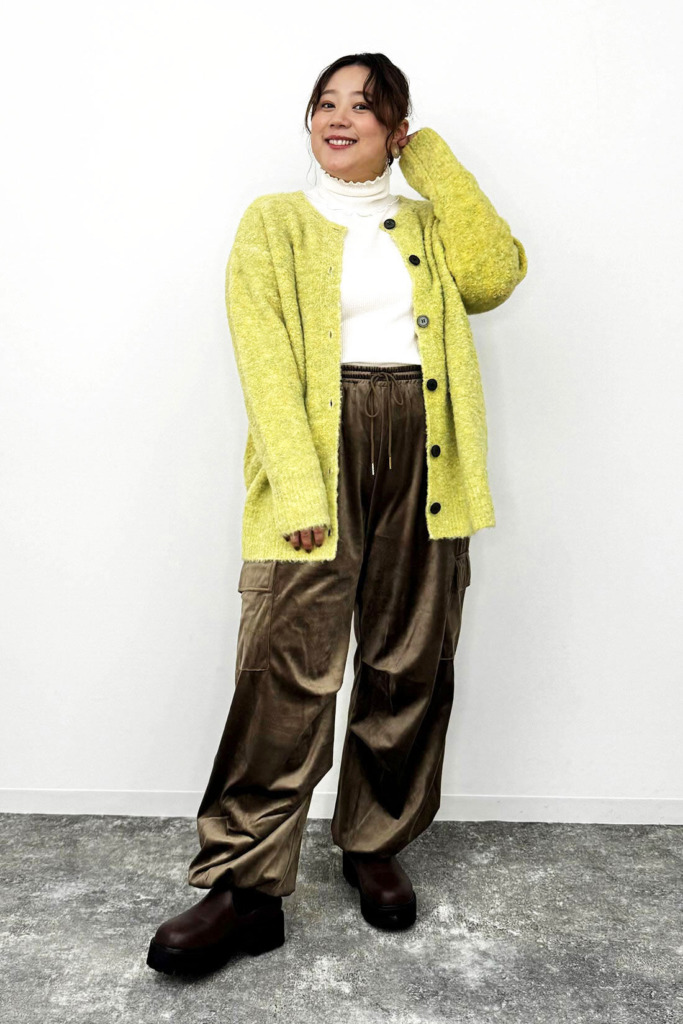 ソフトな肌質の骨格ウェーブさんは、やわらかな素材のアイテムが似合います。上品なベロア素材のパラシュートパンツは、ダボダボしない絶妙シルエット。プードルヤーンのカラーニットカーディガン×メロウタートルを合わせて、大人の甘カジュアルコーデに。パンツと同系色の靴を選ぶと、脚長効果がアップします。