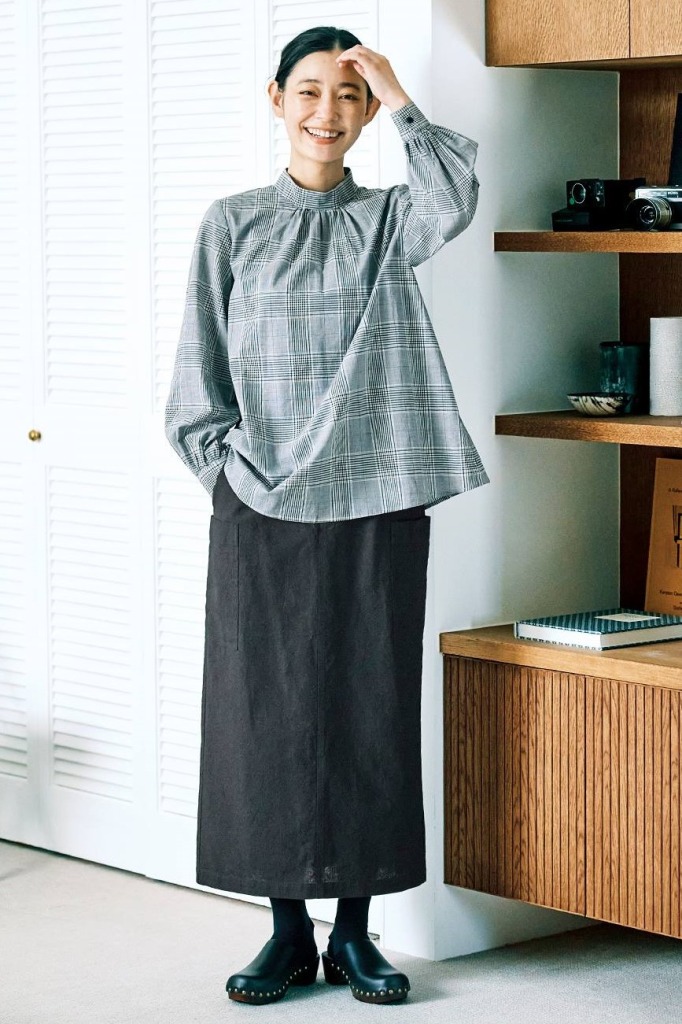 しなやかで光沢のある上品なグレンチェックのハイネックシャツ。首もとと袖口のギャザーが女性らしいやわらかさを演出しています。Iラインのスカートと合わせると縦長効果ですっきりとした印象に。足もとはスタッズのきいたサボで、軽くカジュアル感を出して。秋らしいモノトーンコーデの出来上がりです。