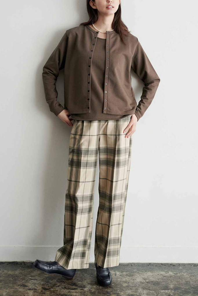 スラリと見えるチェックのストレートパンツ。ぐーんと伸びる素材で作ったほっそりシルエットと、シンプルなチェック柄が細見えを叶えています。トップスはふんわりとしたブラウスにケーブル編みのベストで秋らしさをUP。コーデ次第で、お出かけにもオフィスにも。大人女子には要チェックのストレートパンツです。