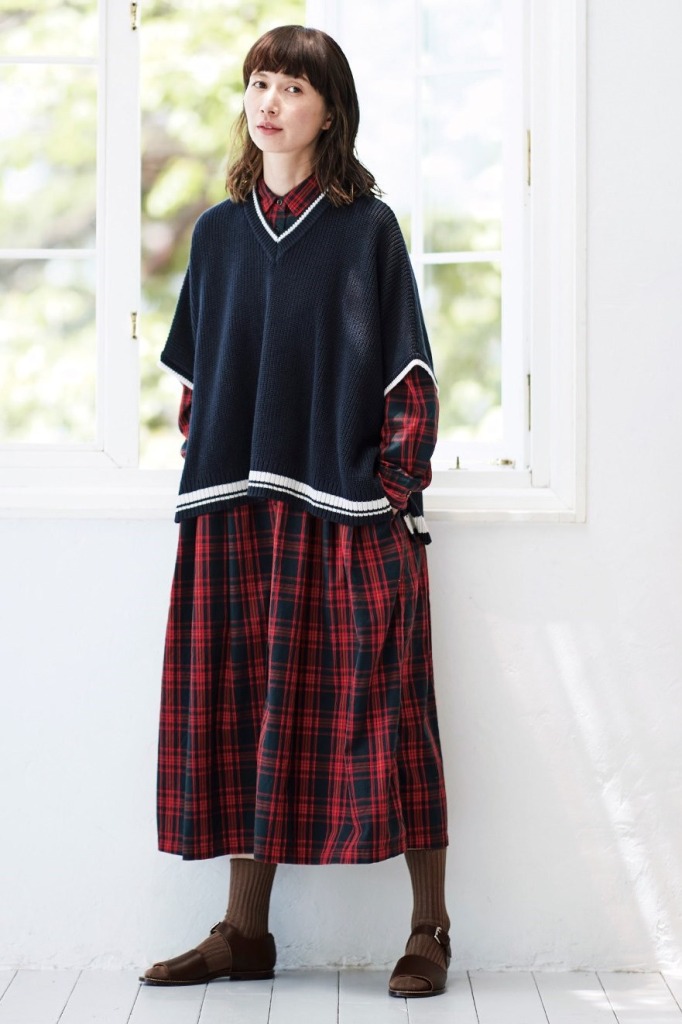 落ち着いた赤×紺のタータンチェックのゆったりとしたワンピース。同じくゆったり感のあるネイビーのジャンボベストとの馴染みもよく、一体感のあるコーデに。足もとはブラウンでトーンを合わせるとさらに秋らしい装いに。カジュアルなお出かけにぴったりなスタイリングです。