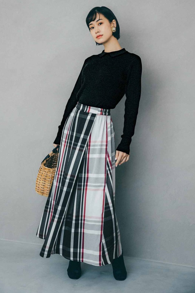 大胆なチェック柄のフレアースカート。ランダムに入れたタックがチェックの表情を変え、凛とした印象を与えています。黒のコンパクトなトップスと合わせると、フィット&フレアーなスタイリングで大人っぽさを演出。映画に出てくるようなヒロインコーデの完成です。