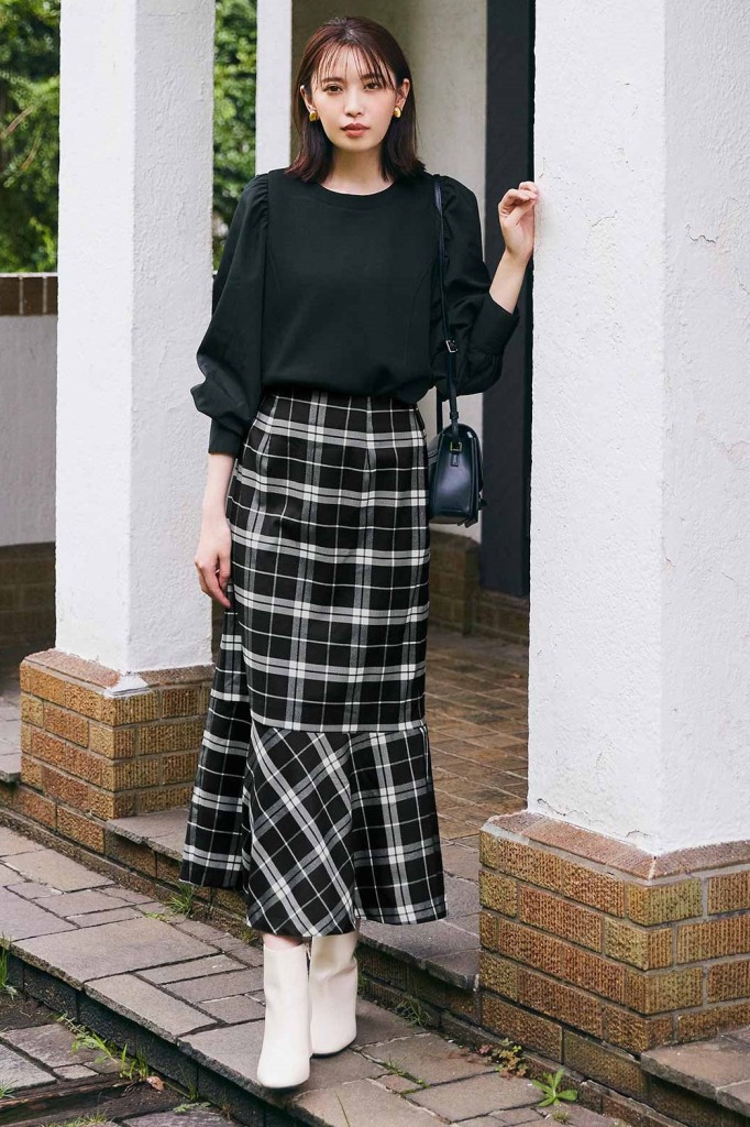 女性らしいシルエットのチェックのマーメイドスカート。黒のふんわり袖のトップスに黒の小さめのバッグとモノトーンでまとめると、きれいめな大人女子の装いに。マーメイドスカートはすその切り替えで上下のチェック柄の印象が変わるのもポイントのひとつ。また、歩くたびにすそが揺れ、大人の美しさを演出しています。