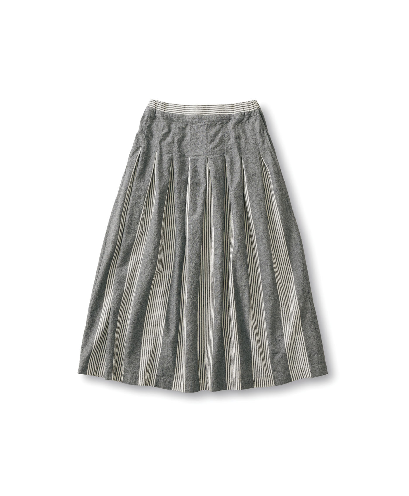 ウエストまわりはすっきりとさせ、切り替え部分からタックを入れた技ありスカートは、グレーの無地とストライプ柄がおしゃれなアイテム。ライトグレーを基調にしたストライプ柄なので、どんなカラーとも相性がよく、シックなブラックで、引き締めるとより大人の落ち着きがプラスされます。