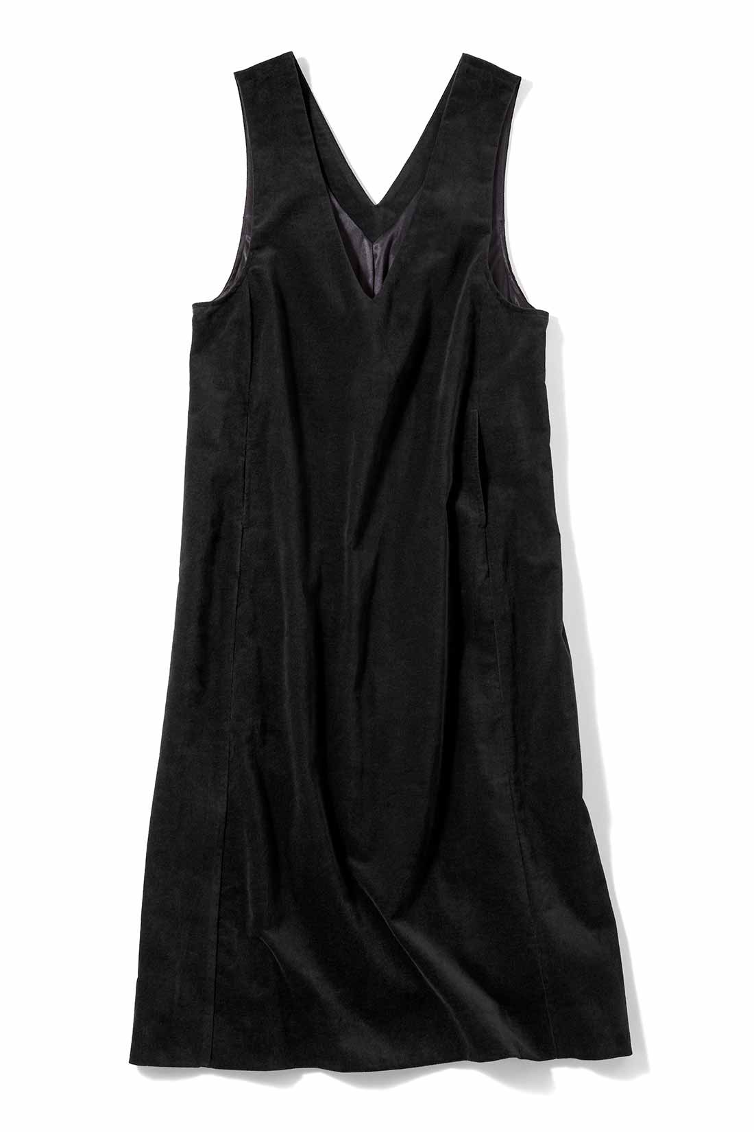 イージーケアなのに高級感のある別珍素材を使った、シャープな印象のVネックラインが大人っぽいジャンパースカート。コットン混のストレッチの利いた素材がリラクシーで、ストンと落ちるシルエットが体形を拾わずすっきり見えも叶います。どんなインナーにも合わせやすく、足さばきのいいバックスリットもポイントです。