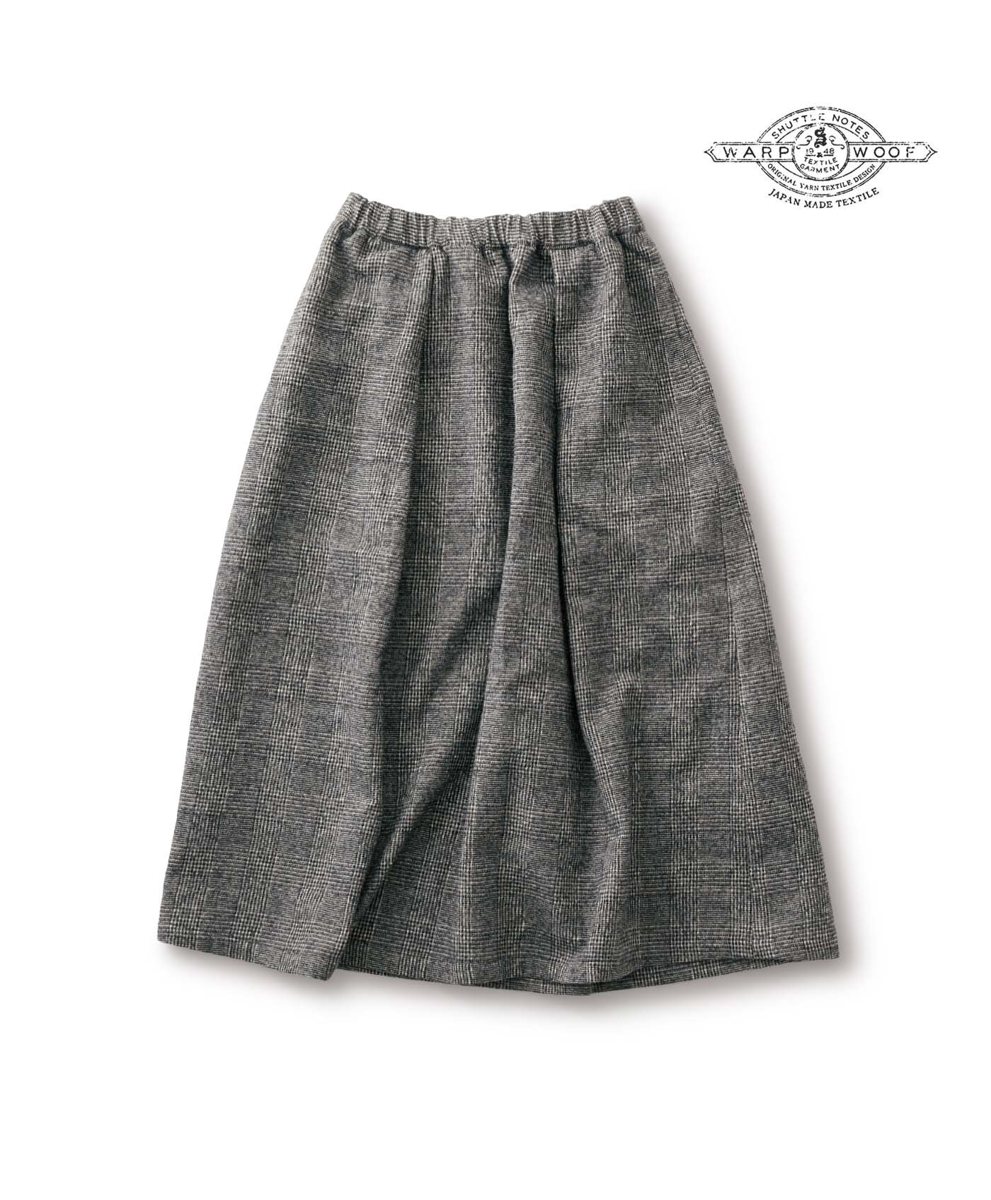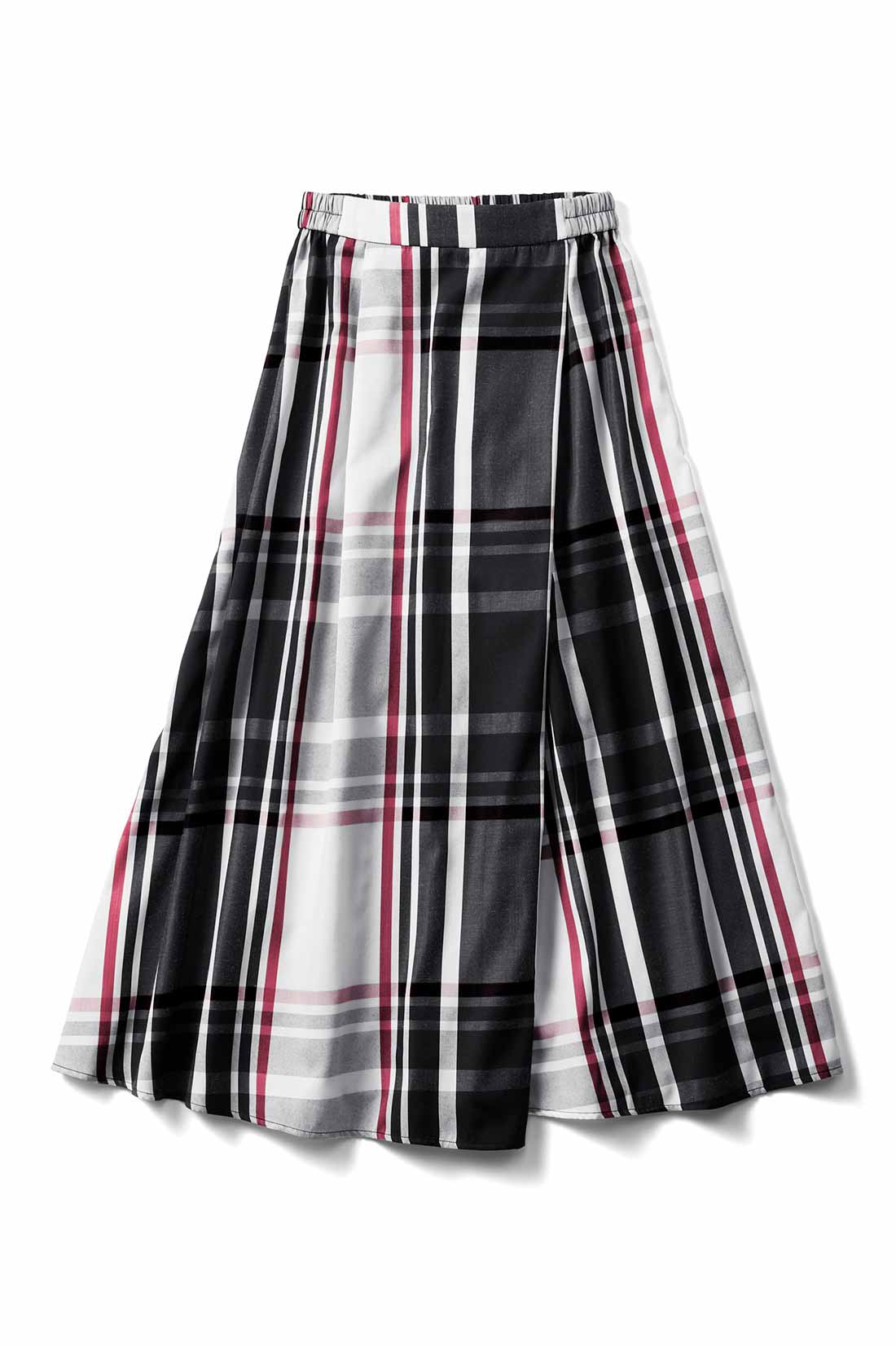 すそに向かってゆるやかに広がるエレガントなフレアーシルエットのスカートは、軽やかで、ほどよい張り感と落ち感のある素材を先染めしたチェック柄が特徴です。大胆なチェック柄ですが、色数をおさえることで大人っぽい凛とした表情が楽しめます。ラップ風のアシメトリーなタック遣いで、単調にならず華やぎのある装いに◎。