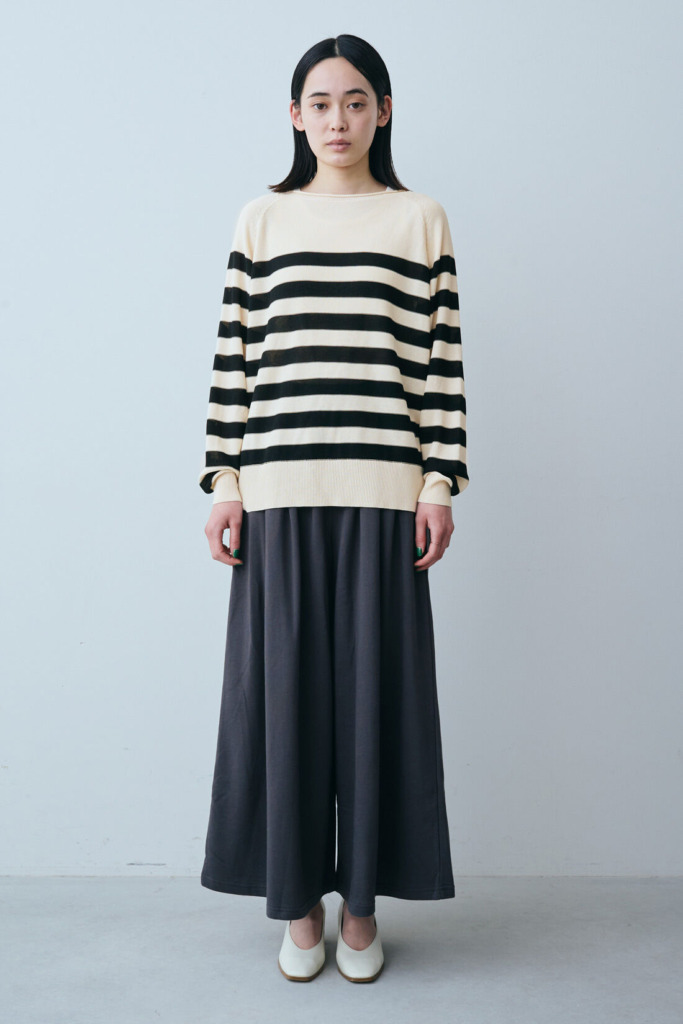 リラックススタイルにぴったりなのがスウェットスカンツ。柔らかすぎない厚みのスウェットなら、ストレートさんでも着こなせるはず。トップスはハイゲージのニットがおすすめです。太めのボーダーでもキレイめな印象で、ボトムスのチャコールグレーと相性抜群。オフィスカジュアルとしても活用できるスタイリングです。