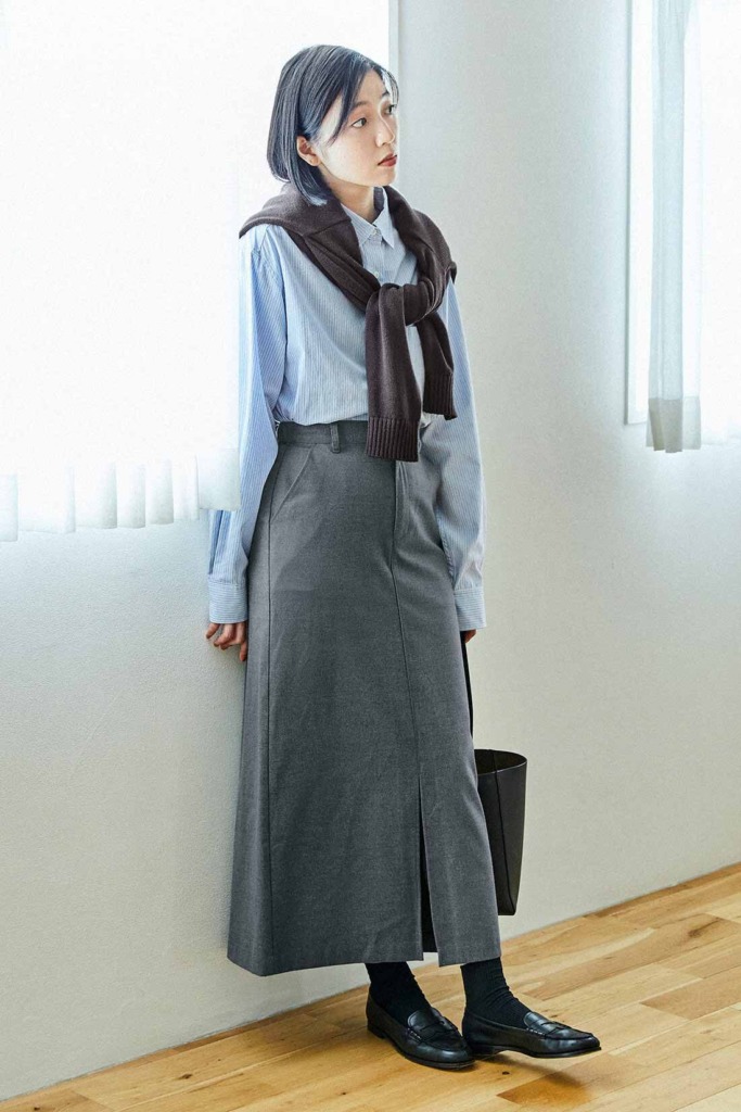 直線的なシルエットのスリットスカートは、骨格ストレートさんをスタイリッシュに見せてくれる1着。杢グレーの色合いはどんなカラーとも相性が良く、ジャケットもカーディガンもマッチするのでコーデに迷わない優等生アイテムです。通勤に使うならシャツや革靴などきっちりとしたアイテムと組み合わせるのがおすすめ。