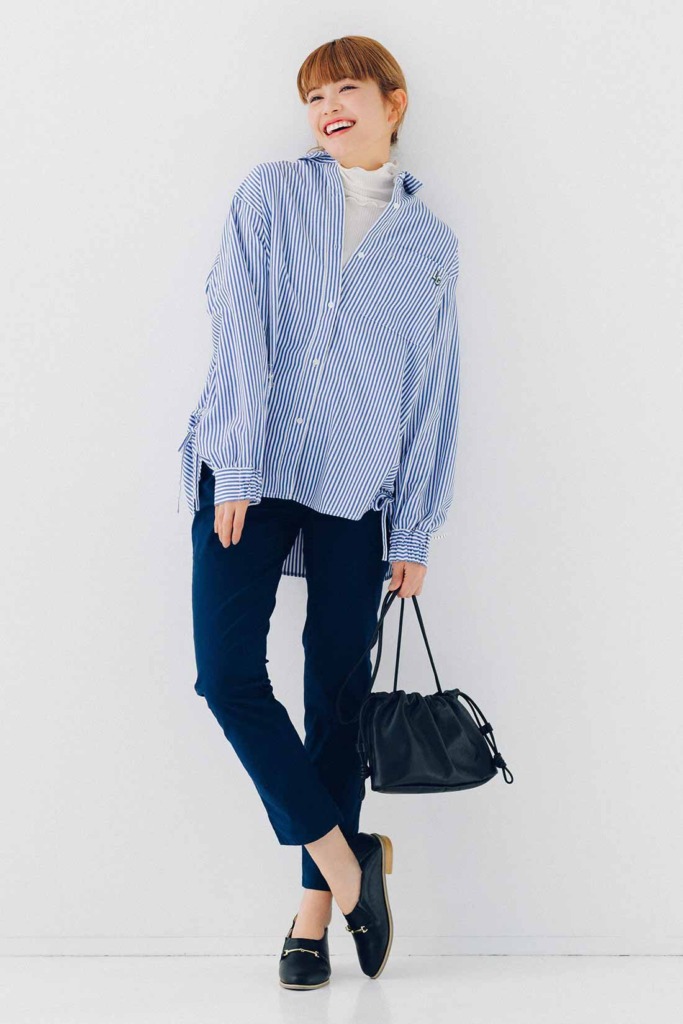 スッキリ見せたい日は、体に張り付き過ぎない細さのパンツをチョイス。ストライプシャツと合わせて薄手のハイネックをインナーに忍ばせれば、トップスにボリュームが出過ぎないレイヤードが楽しめます。ストレートさんは大人っぽい小物も似合いやすいので、ローファーや黒バッグを取り入れてコーデを引き締めましょう。