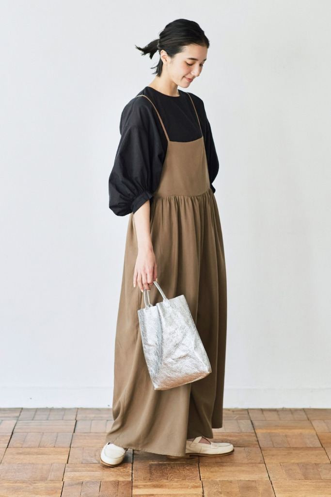 ふんわりスリーブがキュートな黒のブラウスは、サロペットのインにも最適です。シンプルでありながら袖がアクセントになるので、バランスよく決まります。ブラウンのキャミサロペットは、ギャザーのドレープが着映え感のある一着。モダンだけどほんのり甘い、大人のためのサロペットコーデです。