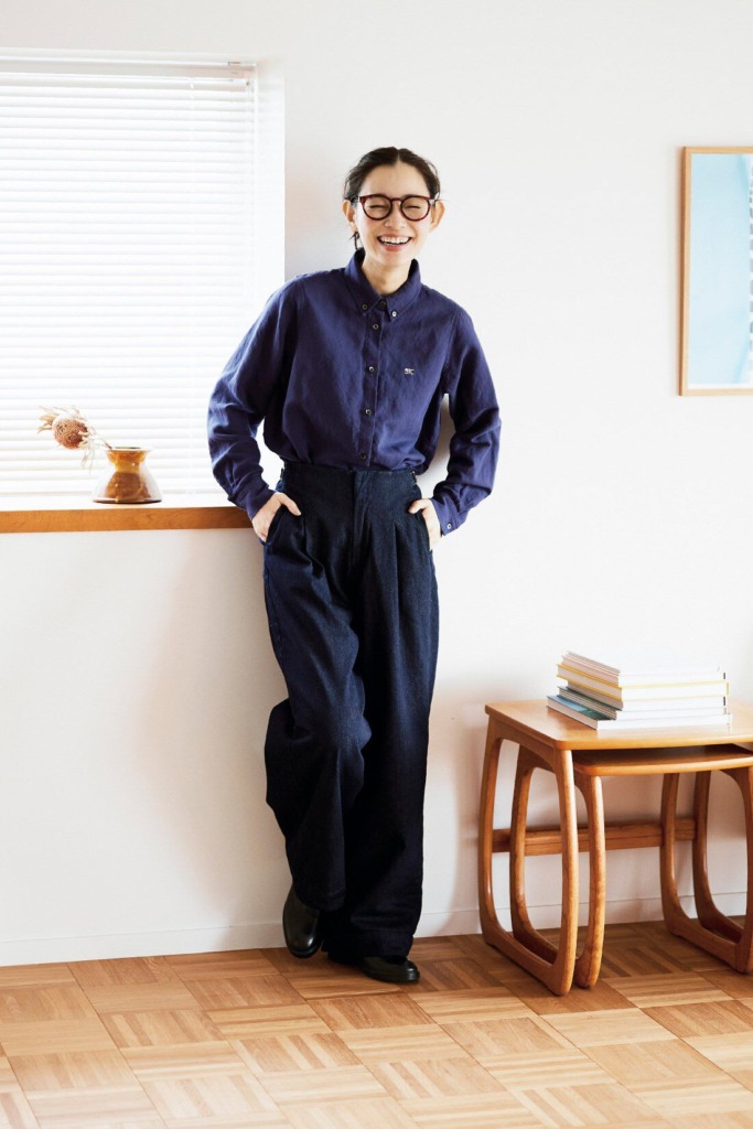 ネイビーシャツと濃紺ワイドデニムのワントーンコーデ。すっきりとしたシルエットと高めのウエスト位置がスタイルアップを実現し、秋冬にぴったりな都会的な印象に。