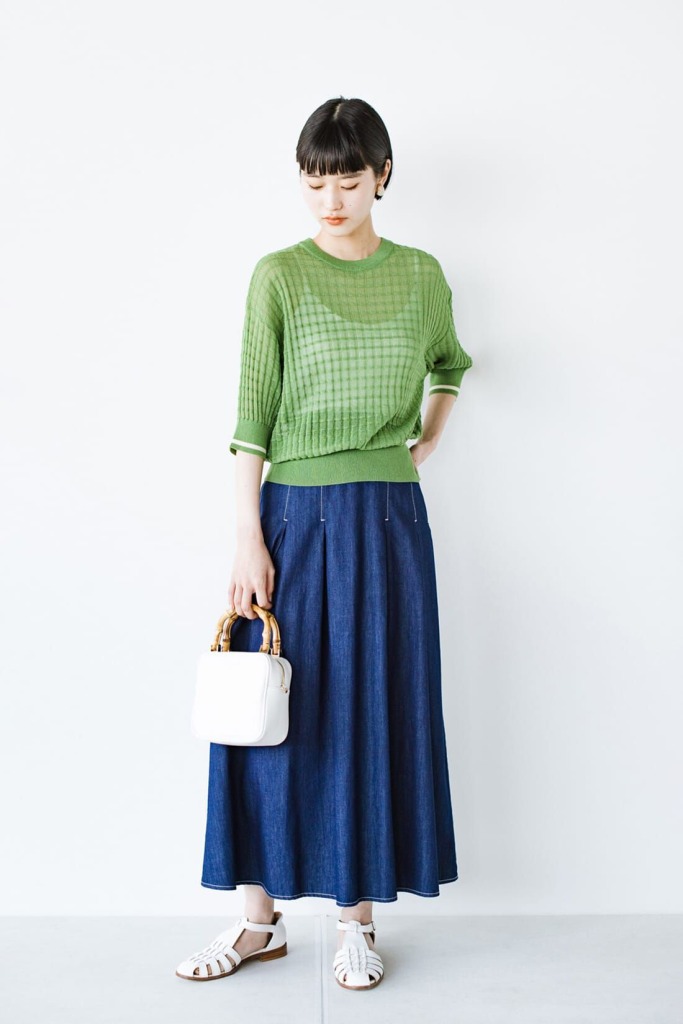 鮮やかなグリーンが目を引くシアーニットに、ふんわり広がるシルエットがかわいいデニムスカートを合わせた、フェミニンカジュアルな着こなし。シアーニットはTシャツよりも上品な印象で着られるうえに、見た目も着心地も涼しげで夏にぴったり。かっちりした白小物で全体を引き締めて、華のある夏らしい着こなしに。