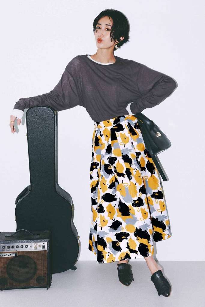 マイルドな透け感のトップスに、ペイント柄がアーティスティックなフレアースカートを合わせた華やかなコーデ。スカートに存在感があるぶん、無地トップスで引き算をしてメリハリを意識。シアートップスの下には白のカットソーを重ねて最旬の着こなしに。小物はモードで引き締め効果のあるブラックがお似合いです。