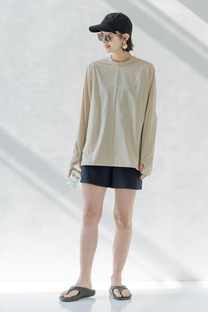 水辺の日差し対策に欠かせないのが「ラッシュガード」。そのまま水に入れるので、プールからキャンプまでさまざまな場面で役立ちます。袖にはサムホールが付いており、手の甲まで日差しから守ってくれるのもメリットです。すそに入ったゴムを使えば水着や体型に合わせてシルエットが変えられて、着こなしの幅も広がります。